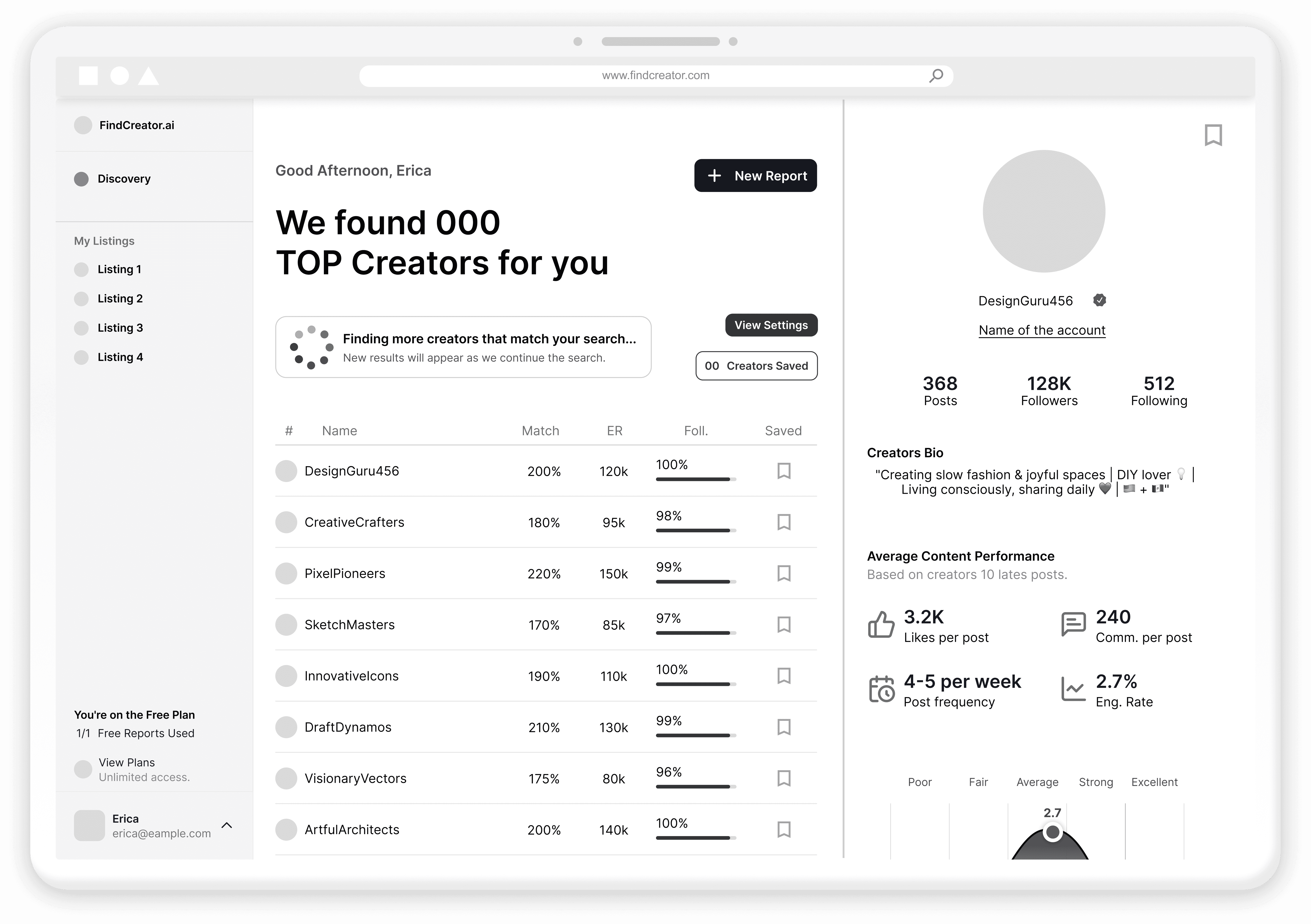 FindCreator is live today (free with limited searches) but still evolving. Even without promotion, some users are coming back to run multiple searches, a strong sign we’re onto something.